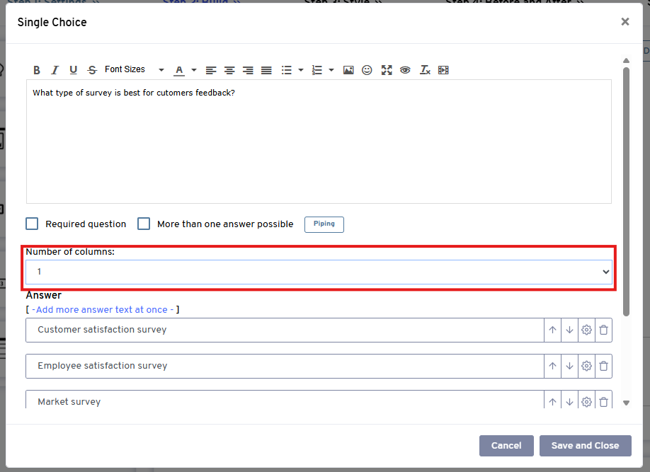 It is possible to change the vertical view(single column) of your answer options to a horizontal display(more than one column). The default display option is a vertical view. You can do this by specifying the number of columns your answer option should have.