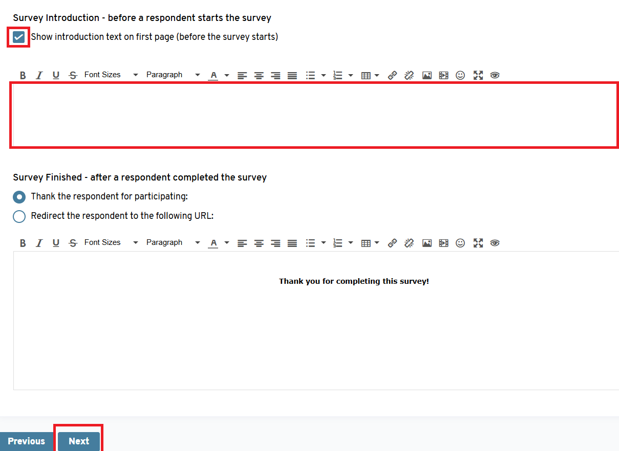 The 'thank you' page will be displayed after the survey has been completed by a respondent. The text can also be added or edited by using the specified editor.