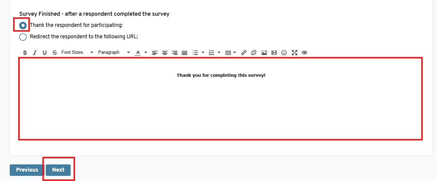 - Click on the radio button option "Thank the respondent for participating" to reveal the editor.