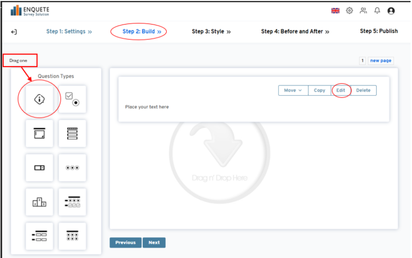 - On “Step 2: Building”, drag and drop the appropriate question types for your survey to the question area on the right.