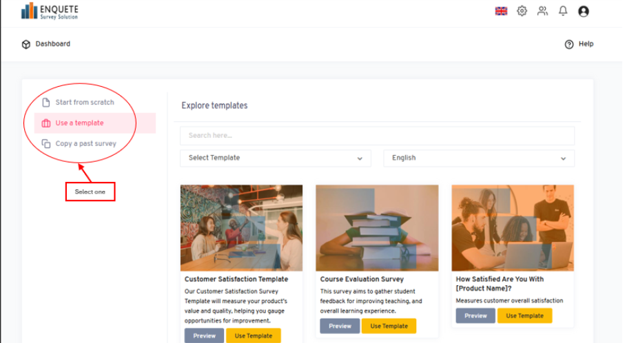 select between “start from scratch,” ”use a template,” or “use a past survey.”