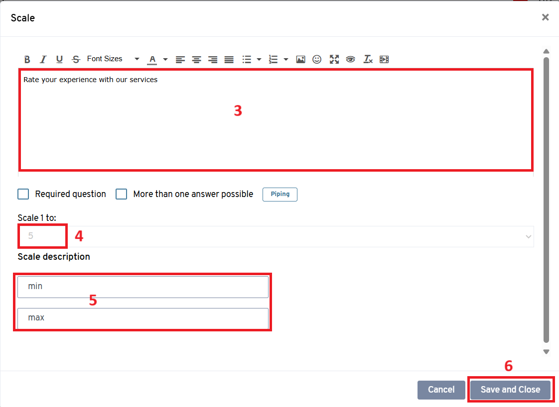 A "Rating" question allows respondents to evaluate a question on a scale. The number of scale choices is set to 5 by default, but you can choose up to 11.