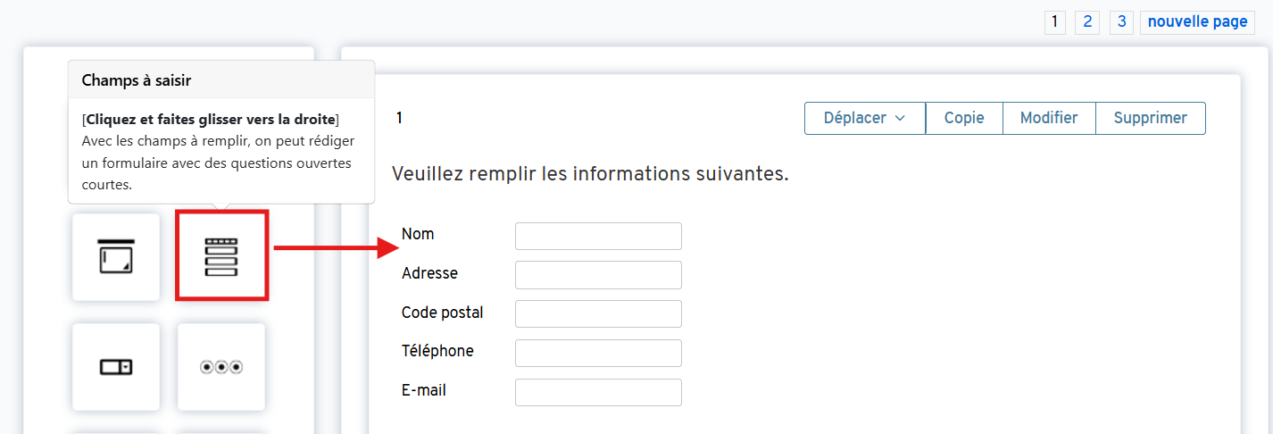 Faites glisser et déposez l'icône "Champ de saisie de texte" vers la droite. Cela créera une question de saisie de texte standard.