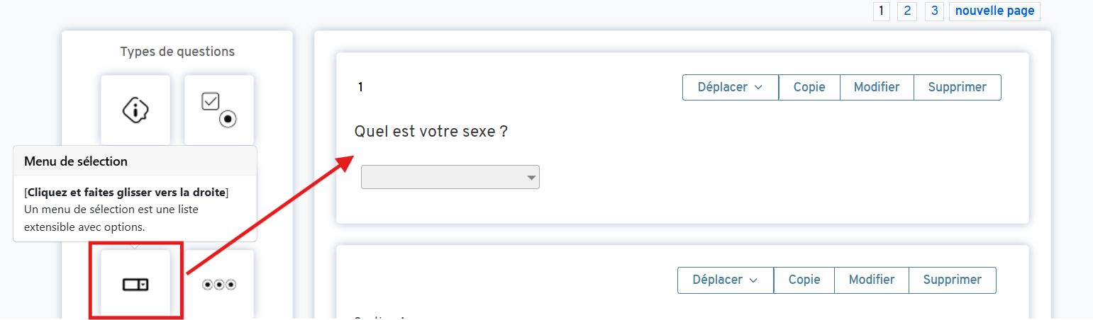 Faites glisser et déposez l'icône "Menu de sélection" vers la droite. Cela créera une question de saisie de texte standard.
