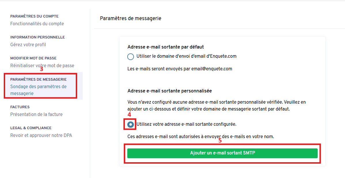 Sélectionnez « Utiliser votre adresse e‑mail sortante configurée », puis cliquez sur « Ajouter une adresse e‑mail sortante personnalisée » pour ouvrir la fenêtre correspondante.