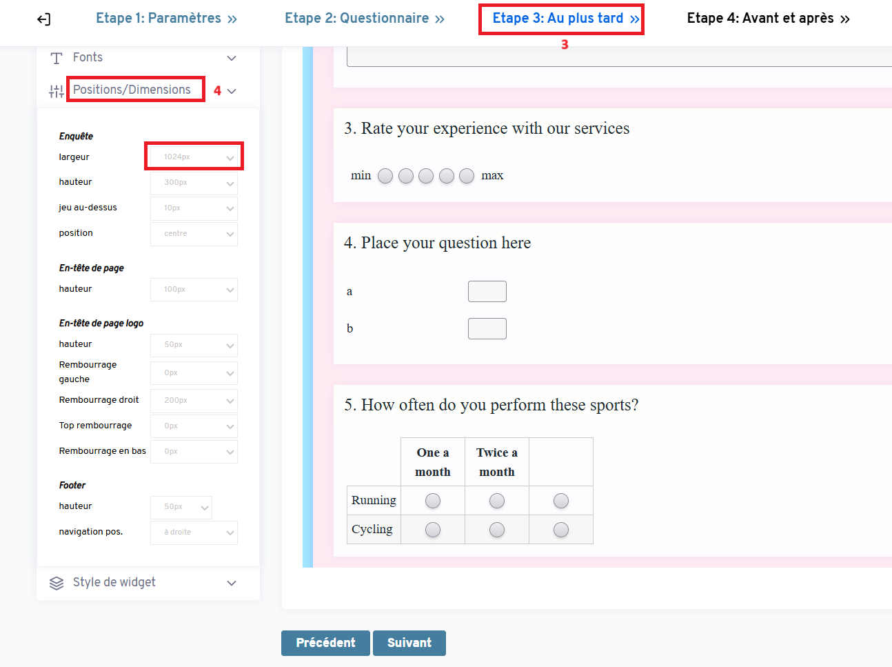 Si vous remarquez que certaines options de votre enquête en ligne ont du mal à s’afficher correctement sur la page, vous pouvez résoudre ce problème en augmentant la largeur de votre enquête en ligne. Cela peut être facilement fait à l'étape 3 lors de la modification de votre enquête. Voici une brève description de la procédure à suivre.