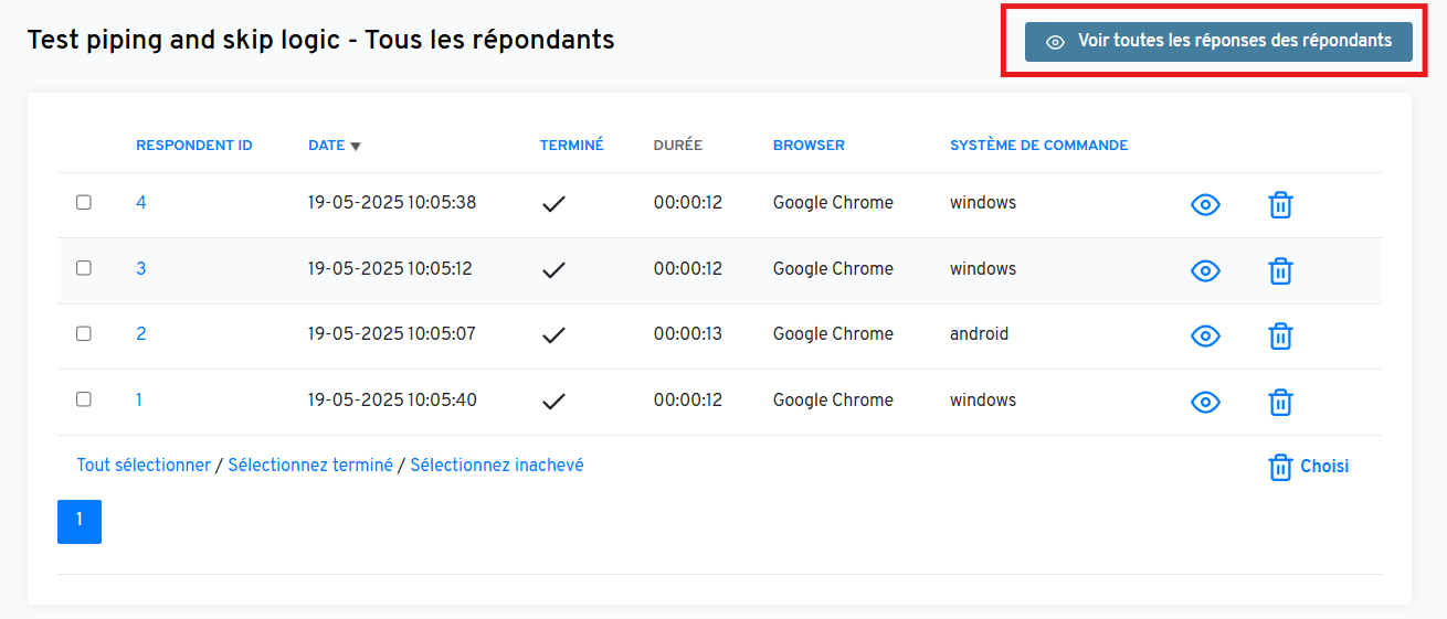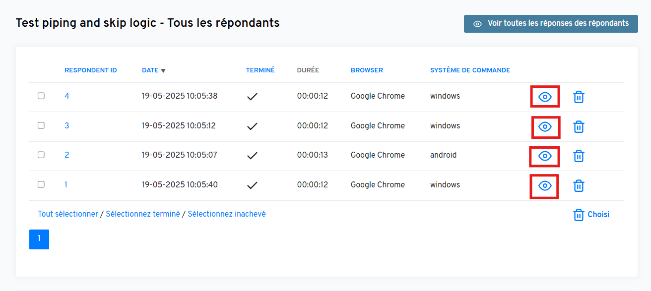 Vous verrez maintenant un aperçu complet de tous les répondants. Cliquez sur l’icône Voir d’un répondant pour afficher sa réponse.