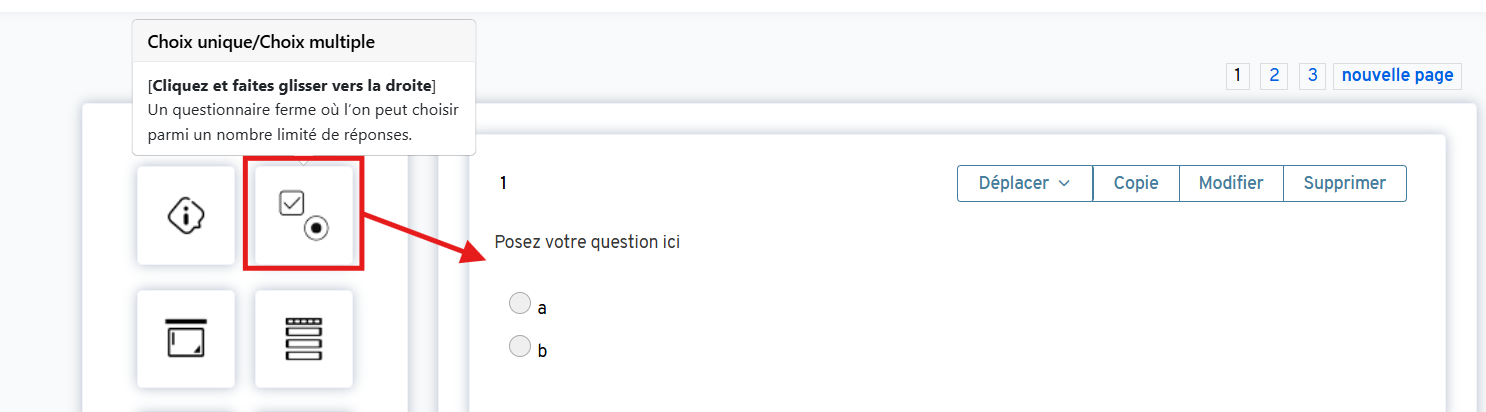 À l'Étape 2 : Construire de votre processus de configuration de l'enquête, faites glisser et déposez l'icône "Choix multiple" vers la droite. Cela créera une question standard à choix unique pour vous.