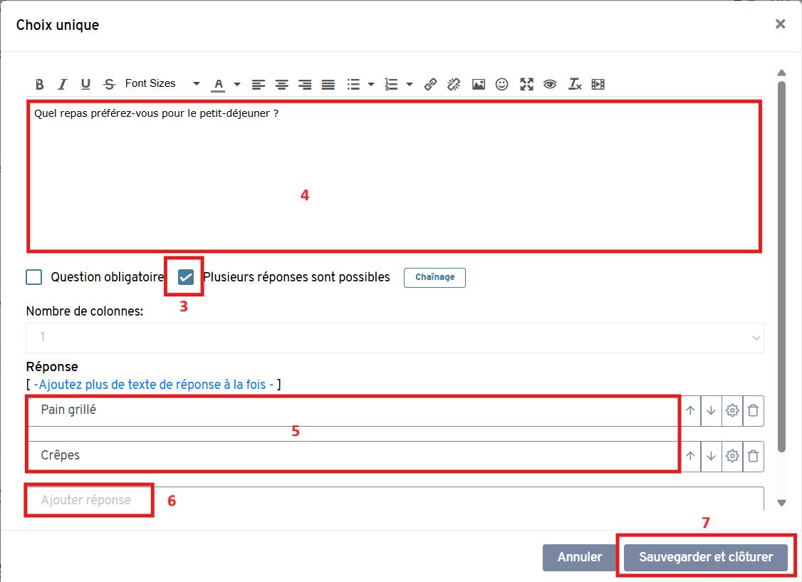 Assurez-vous que l'option "Plus d'une réponse possible" est cochée si vous souhaitez permettre plusieurs sélections.