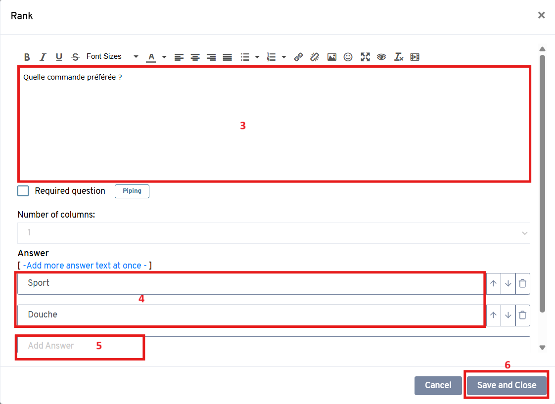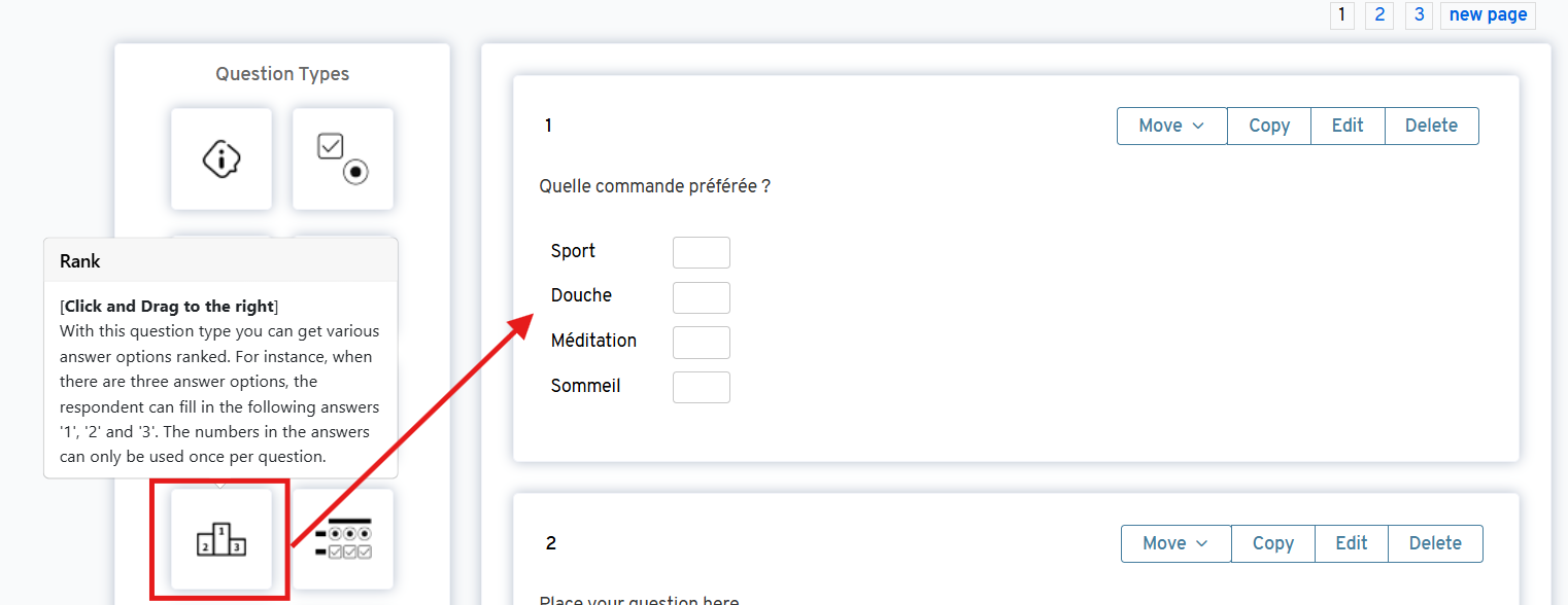 Les questions de classement sont utilisées pour identifier les préférences d'un répondant. Les options de réponse sont remplies dans l'ordre de préférence, en commençant par 1 jusqu'au nombre maximum d'options de réponse.